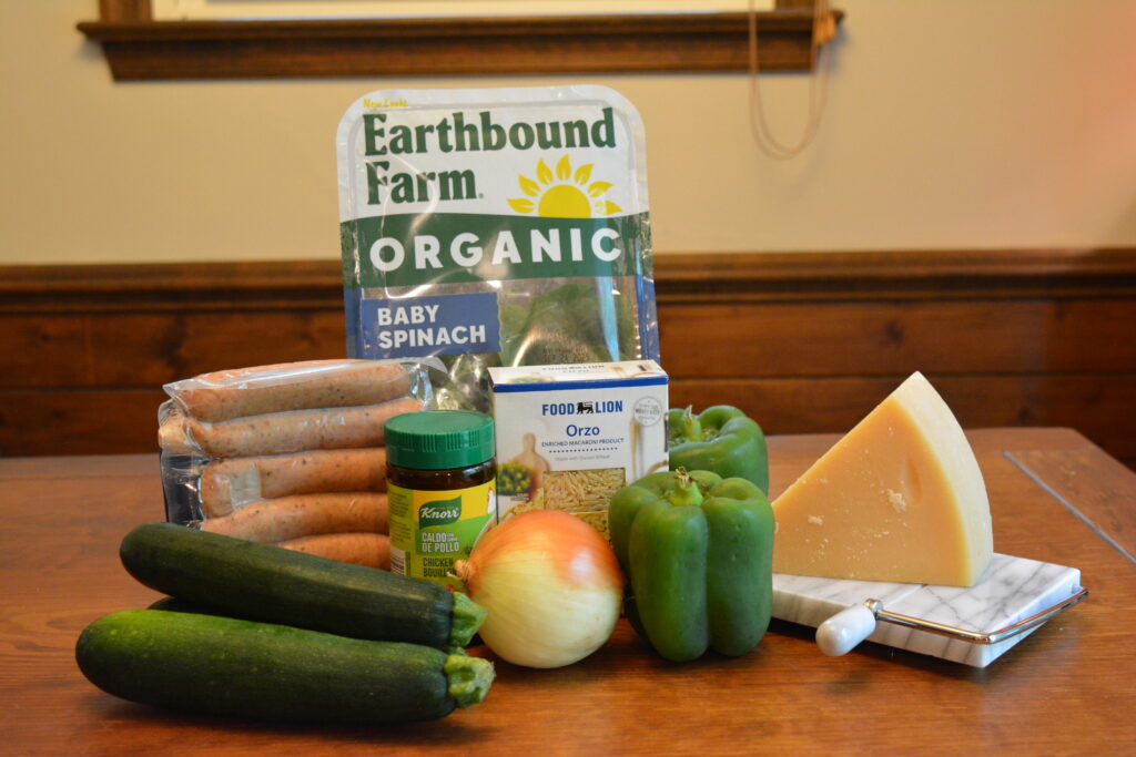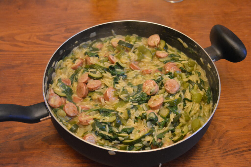 4. Orzo takes 8-10 minutes to cook, but follow the directions for the specific brand you’re using. After the orzo has boiled 8 minutes, or is almost completely done, add in the entire bag of spinach and your cut up sausage. Stir until it’s all mixed in and the heat will wilt down the spinach. Turn off the heat. I recommend tasting for seasoning and adding more of whatever you think it needs.