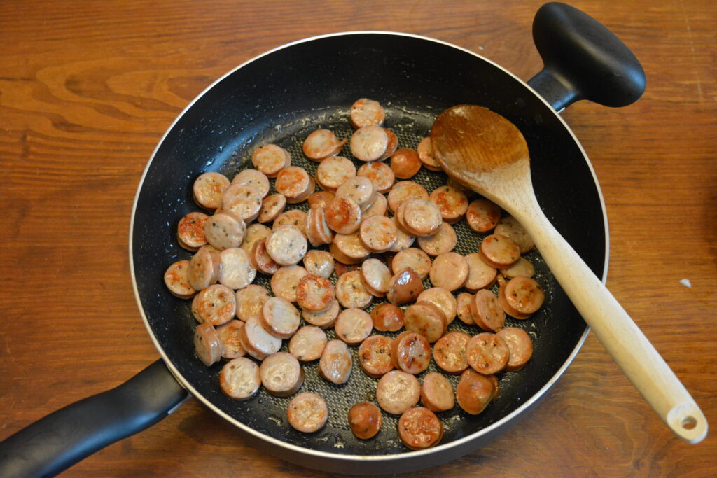 1. Chop chicken sausage into bite sized pieces and throw into a pan on medium heat. The sausage is precooked, so I like to just heat it through and get some golden-brown color on it. Remove the sausage from the pan and set aside.