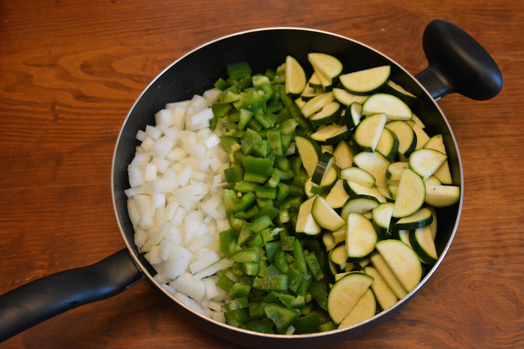 2. Pour the oil into your pan get it heating on medium heat. Once hot, throw in the onions and let them cook for about 5 minutes, just to get them started. Put in your diced peppers and let cook for another 5 minutes.