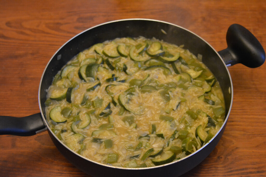 I love this recipe because it’s such an easy weeknight meal. Once the prep of cutting the vegetables is done, it takes less than 30 minutes until the whole meal is done. I also love how many vegetables can be stuffed into this meal. I have listed the usual ones: onion, pepper, and some spinach; however, any vegetables you love would go great in this dish. I decided to put zucchini in the orzo this time and it turned out amazing! It’s completely optional, but it’s one of my favorite vegetables that’s so versatile, so I’ll keep adding zucchini. If you like, you could add mushrooms, peas, eggplant, carrot, really anything you want. To me, the sky is the limit to adding veggies into this dinner. I especially love a one-pan meal like this, because I don’t have to prep all the veggies separately in order to have a meal that’s filled with vegetables.